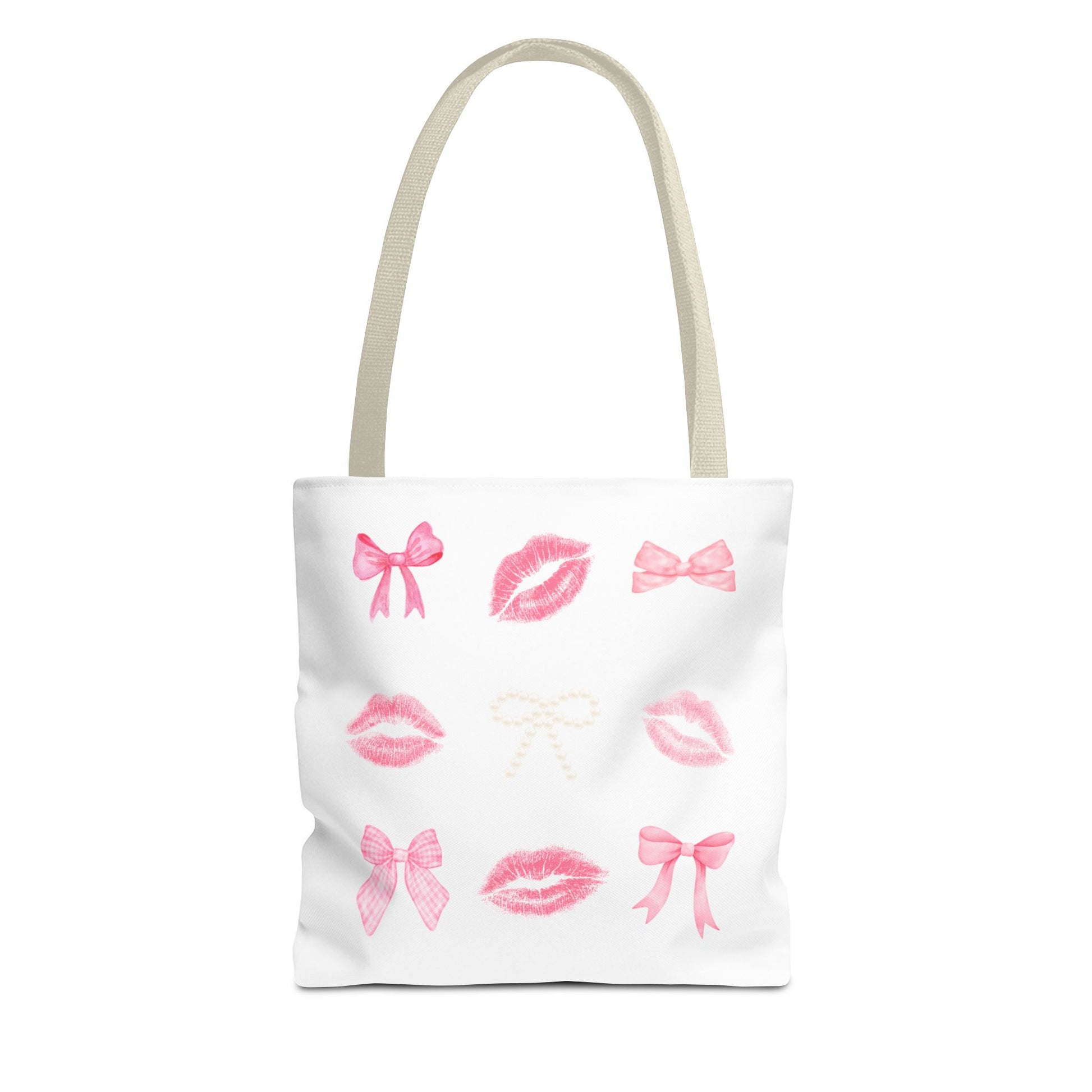 Introducing a stylish Tote Bag that combines practicality with a touch of playful charm. Designed with a delightful pattern of pink bows and kiss marks, this bag brings a cheerful vibe that’s perfect for any occasion. Whether you’re heading to a coffee date, a shopping spree, or attending a casual gathering with friends, this Tote Bag is your ideal companion. It's especially relevant for women who love fashion and express their personality through unique accessories. Great as a gift for birthdays, Valentine's Day, or anniversaries, it’s a thoughtful choice for those who appreciate both style and functionality. The bag’s vibrant design makes it a standout piece, ensuring you not only carry your essentials but do it with flair.